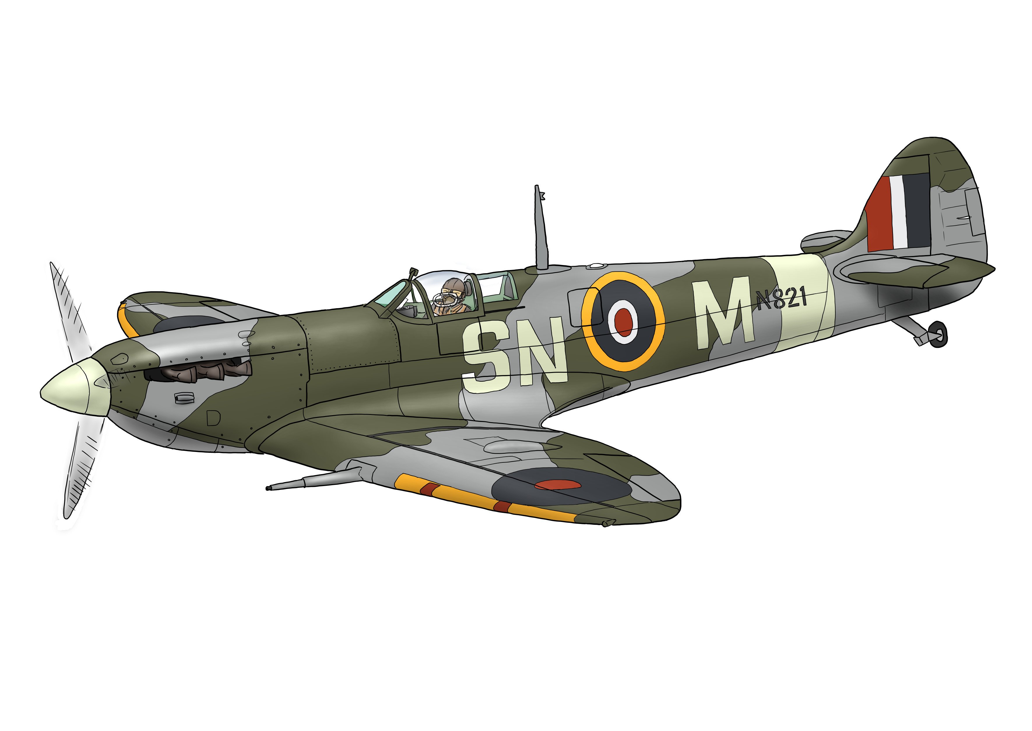 (塗マ解説) 243sqn所属時のEN821。とても綺麗な空撮写真が残っており、非常に有名な機体。 個人的に一連の空撮は初期のスピットファイアを象徴しているんじゃないかな、と思っている。 そんなEN821だが、ノルマンディー上陸作戦では英海軍808sqnで参加するも(艦載用の改造はされず)、艦砲射撃時のスポッティング中に撃墜され喪失されている(パイロットは戦死)。