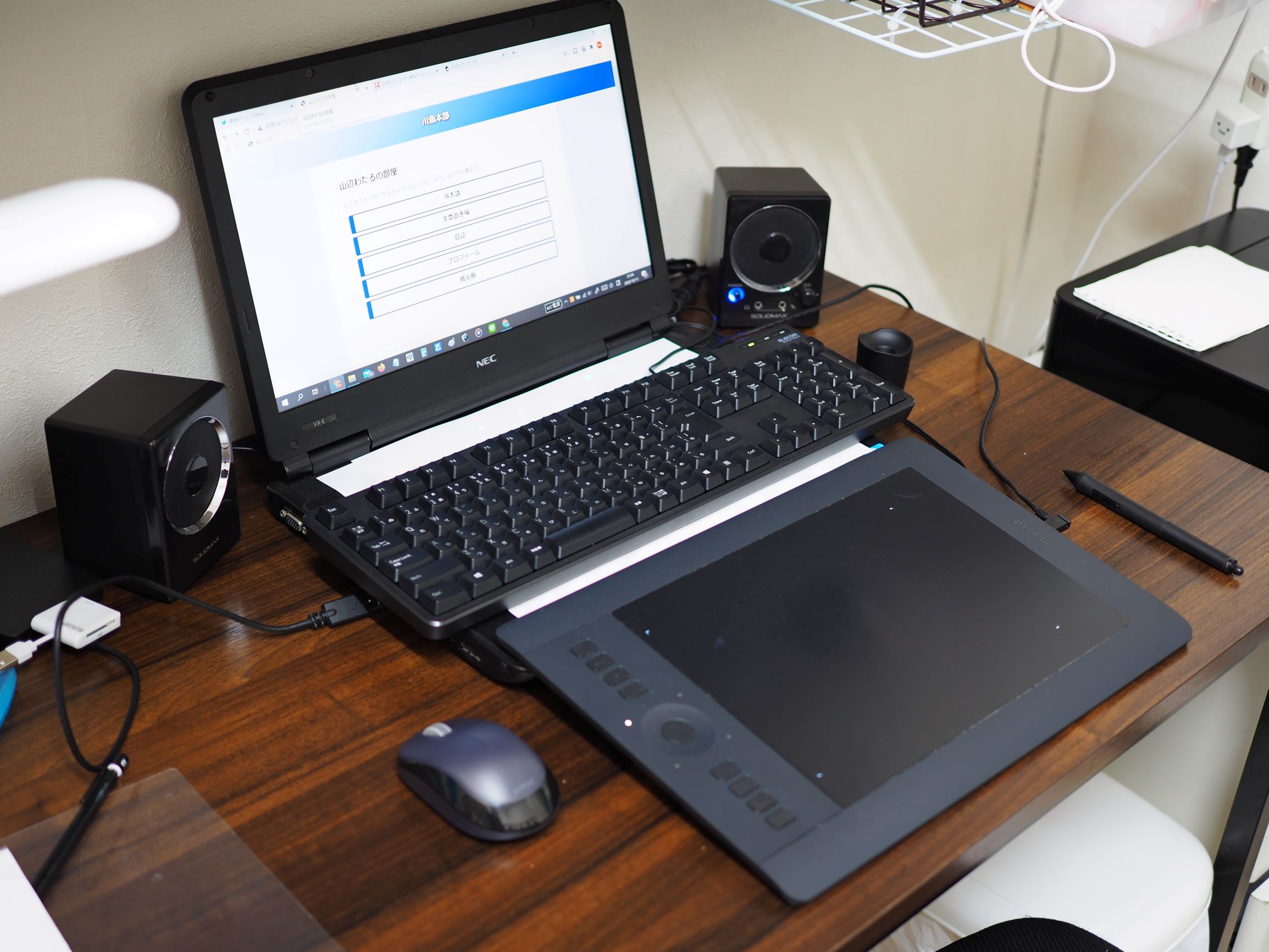 右利きなのにマウスが左側にあるのは、お絵かき時にマウスを左手デバイスとして用いているため(なのでワイヤレスマウスを重宝する)。ペンタブ左側のショートカットキーもかなり多用している。